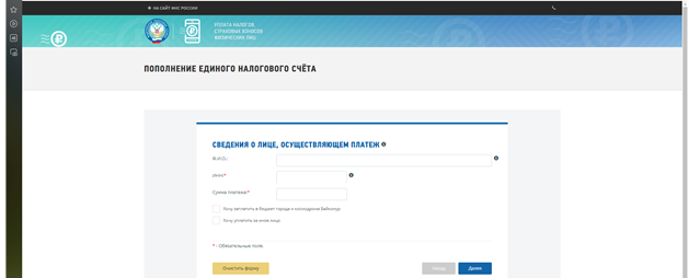 Вносим обязательные данные налогоплательщика (ФИО, ИНН, сумма платежа).