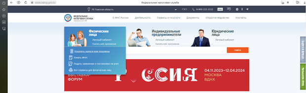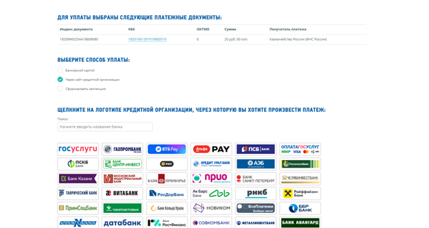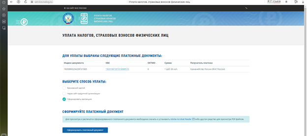 Памятка, позволяющая сформировать квитанцию, либо оплатить онлайн сумму налога